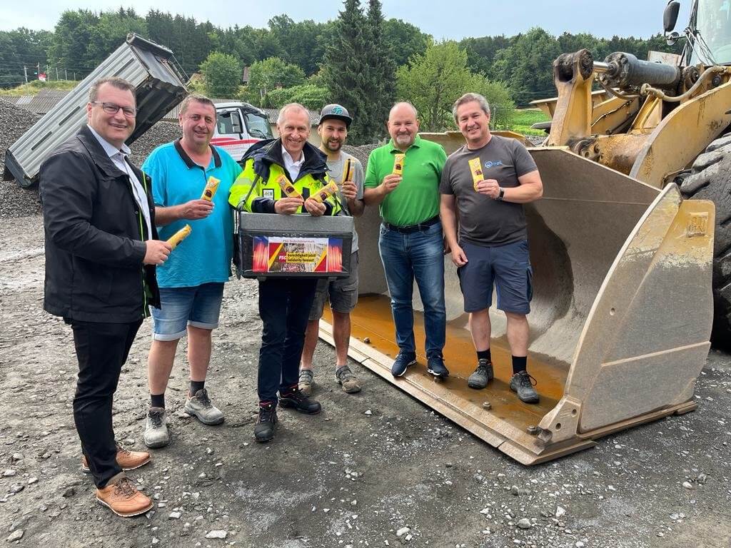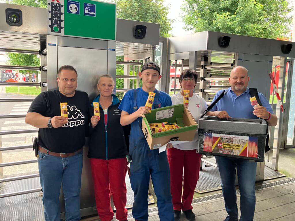 AK-Steiermark-Präsident Josef Pesserl, FSG-Vorsitzender Günter Pint und FSG-Regionalsekretär Karl Heinz Platzer bedankten sich wie schon in den Jahren zuvor bei dem Beschäftigten der Region mit über 4.300 Stück Eis für die geleistete Arbeit. Bei Temperaturen um die 25 Grad kam die Erfrischung genau richtig.