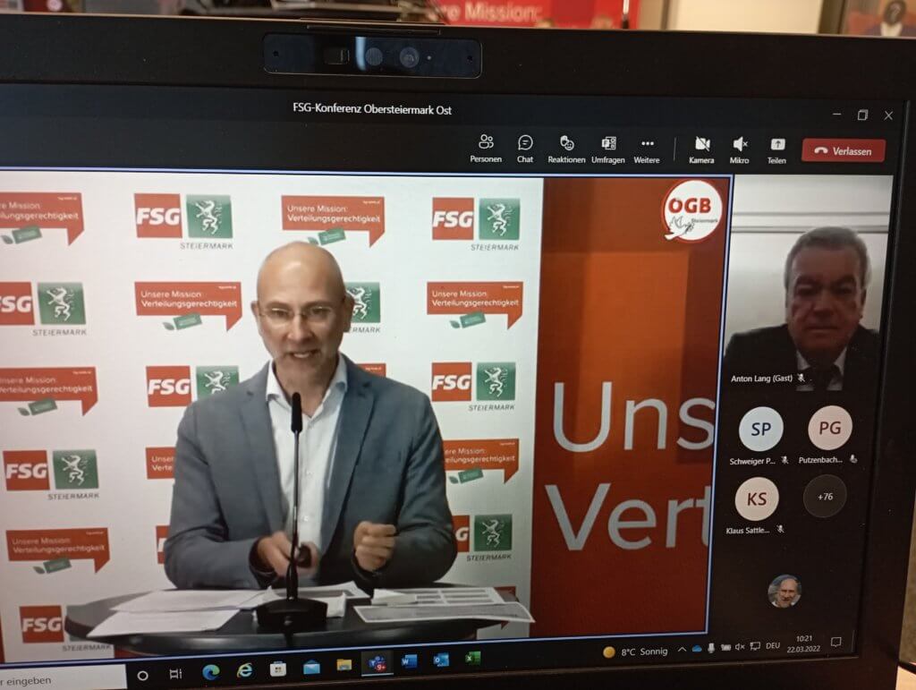 Am 22. März 2022 kam die FSG Obersteiermark Ost zu ihrer Regionalkonferenz zusammen. Die Konferenz, die in Videoform abgehalten werden musste, begann mit der Einspielung eines kurzen Statements, das Bundes-Fraktionssekretär Willi Mernyi für die Region aufgenommen hatte. Daran schloss sich eine Solidaritätsadresse an die Menschen in der Ukraine und an die von dort Geflüchteten, die Landes-Fraktionssekretär Wolfgang Waxenegger im Namen aller KollegInnen anbrachte.