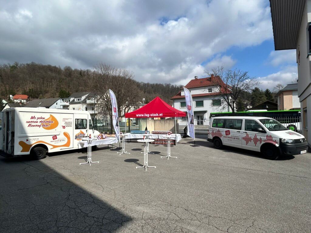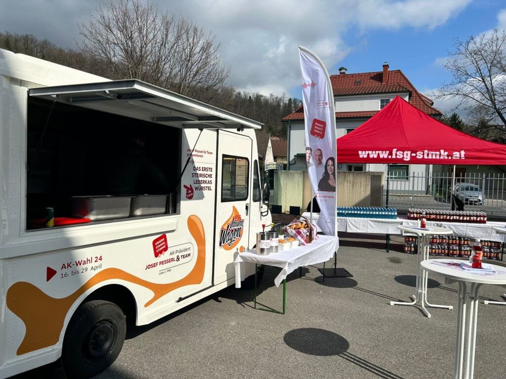 Seinen ersten innerbetrieblichen Einsatz absolvierte unser Jausenwagen am 8. März: Das Team AK Präsident Josef Pesserl – FSG Liste 1 ist seit vergangener Woche steiermarkweit unterwegs, um hungrige Steirer:innen mit exklusiven Leberkäswürsteln mit Kren-Senf zu verwöhnen! Schau auch Du bei einem unserer öffentlichen Termine vorbei: https://fsg-stmk.wird-neu.at/termine/