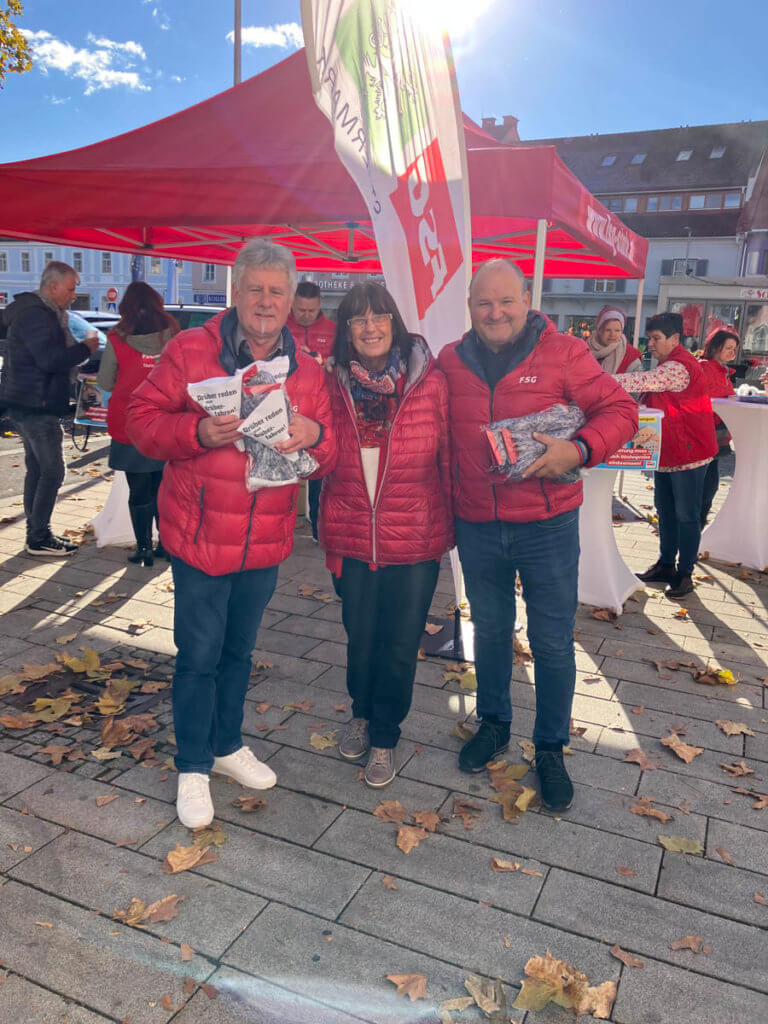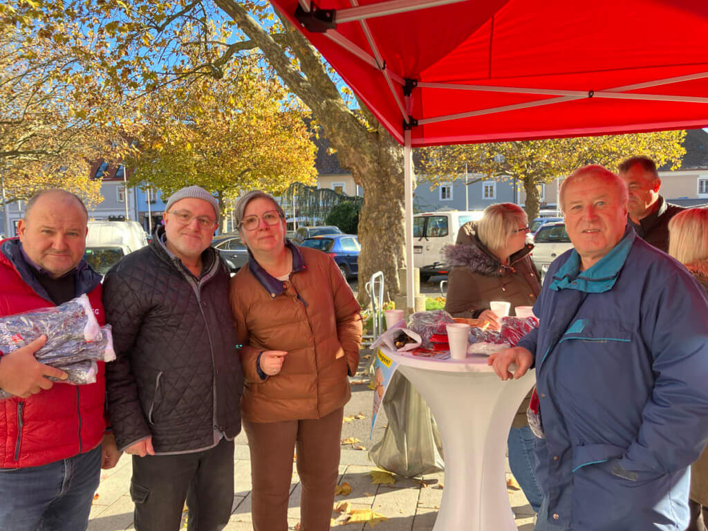 Bei traumhaftem Wetter konnten wir die vielen Besucher:innen über die derzeit stattfindenden KV-Verhandlungen und über weitere wichtige gewerkschaftliche Themen informieren. Wie immer dabei war auch AK-Steiermark-Präsident Josef Pesserl, der die umliegenden Firmen besuchte und Kastanien verteilte.