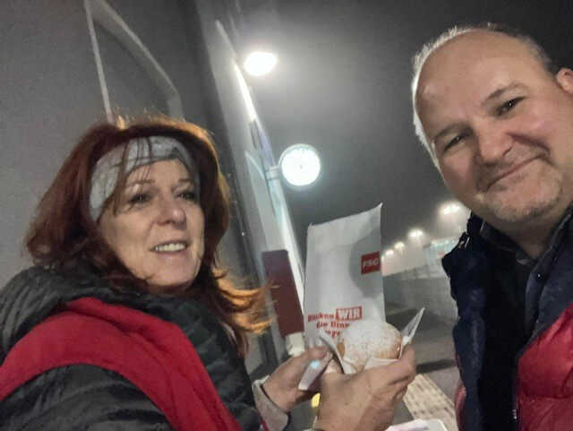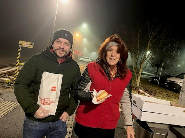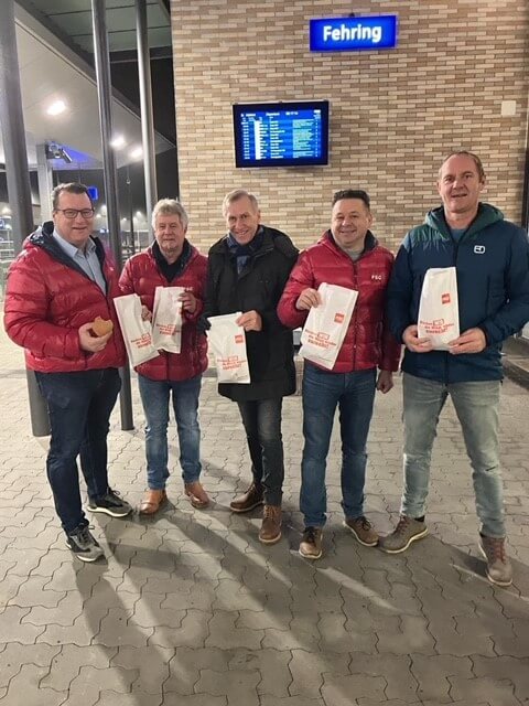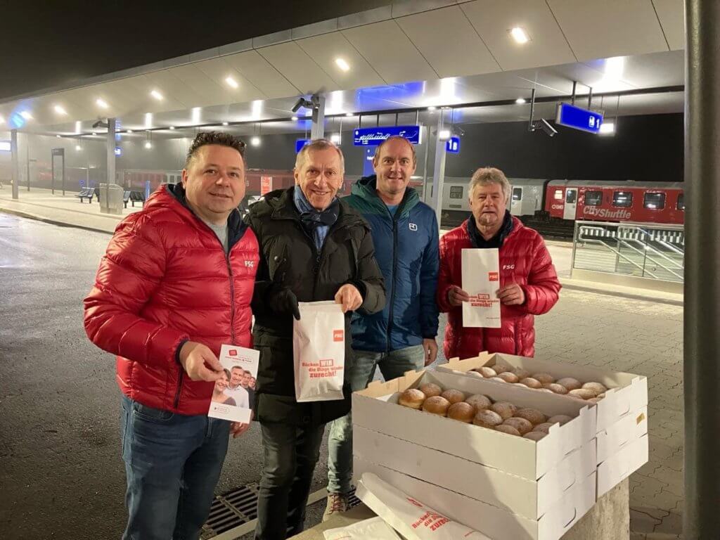 Wie alle Jahre zum Rosenmontag verteilten die FSG- Funktionär:innen der Südoststeiermark auch heuer unter tatkräftiger Mithilfe von AK-Präsidenten Josef Pesserl ab 5.00 Uhr Früh auf den Bahnhöfen in Fehring, Feldbach, Studenzen und Bad Radkersburg Krapfen für die Pendler:innen der Region.